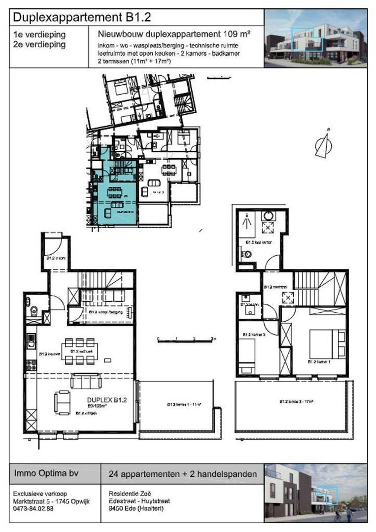 Dit stijlvolle duplex appartement van 109m² is gelegen op de eerste en tweede verdieping van blok B. We komen binnen in deze duplex op de eerste verdieping via de inkom en kunnen zo naar de berging, apart toilet en de leefruimte met open keuken en aansluitend terras van 11m². Via de trap komen we op de tweede verdieping in de nachthall terecht waar we de badkamer, technische ruimte en de 2 slaapkamers met aanliggend terras van 17m² kunnen terugvinden. Mogelijkheid tot aankoop van ondergrondse berging, autostaanplaats of garagebox. Prijs excl. BTW & kosten.